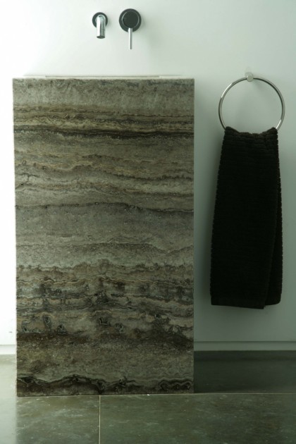Two of the bathrooms of this residence, stand-out. Dimpomar supplied Silver Travertine for the guest toilet. This material is present in the washstand - our Cubic model - and in one wall. In the "master bathroom" the beautiful Bianco Carrara marble was the material chosen for the walls (polished) and shower-tray (sandblasted).
