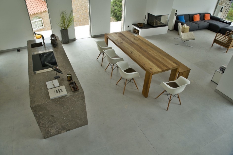Esta moradia da Malveira da Serra escolheu a suavidade de tons cinza do calcário português Ataíja Azul no acabamento jato de areia nos pavimentos comuns de toda a casa, interiores e exteriores que se estendem e ampliam, bem como rodapés e escadas.
