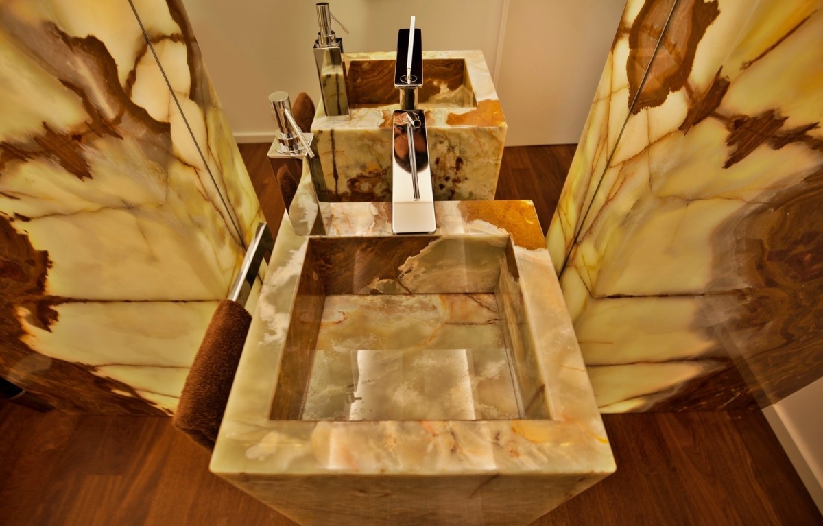 A explosão de beleza termina na casa de banho do piso térreo em Onyx Branco polido: sala de arte natural em que esta matéria é retroiluminada para acentuar a profusão de cores e a translucidez desta pedra natural. A execução do lavatório com o nosso design "Cubic" foi realizada com perfeição pela nossa equipa.