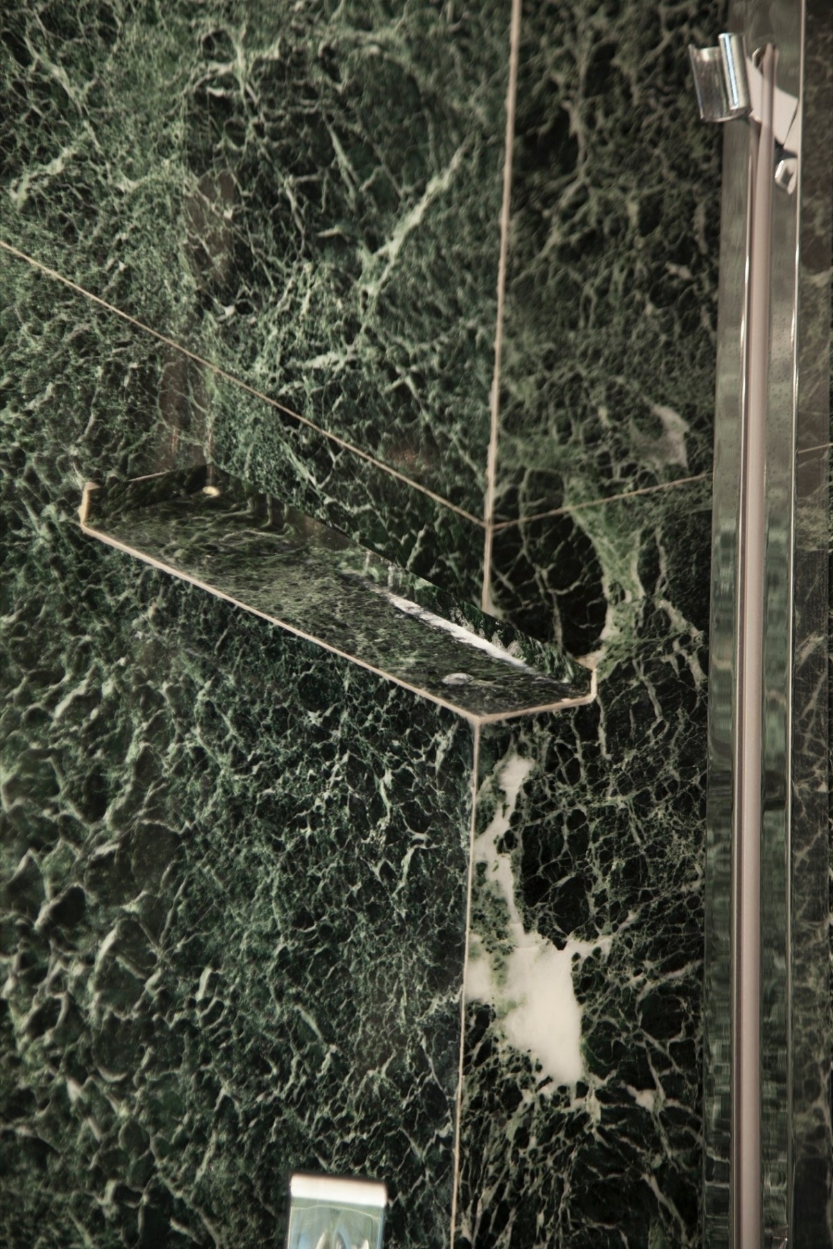 A casa de banho principal retoma o negro mas com veio dourado: um lote intenso de mármore Ouro Negro nas paredes contrasta com o imaculado Branco Thassos no pavimento e tampo. Estamos, de repente, na primeira sala de um museu de arte grega. A visita continua na casa de banho social, que nos apresenta o mármore Tinos Green polido (revestimento), relembrando tempos idos da Antiguidade Clássica, ele também aliado ao mármore Branco Thassos (pavimento, tampo, base de duche).