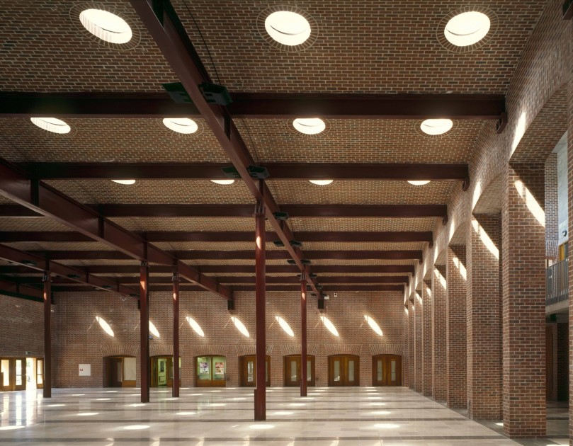 Pátio em centro de estudantes com mais de mil metros quadrados em calcário Gascogne Beige/Blue (malhado), acabamento amaciado, e cerca de 300m2 em Azul Valverde, ambos na espessura de 1,3cm para pavimentos.