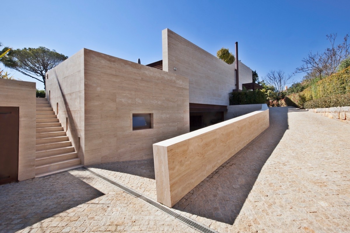 O Travertino Romano, intemporal e inevitável, acompanha toda a residência: começa no revestimento exterior das fachadas, continua no chão e paredes das casas de banho (Parte I), segue pela generosa ilha de cozinha, e termina nas prateleiras da sala (Parte I), elementos maciços com rasgos à medida para iluminação led.